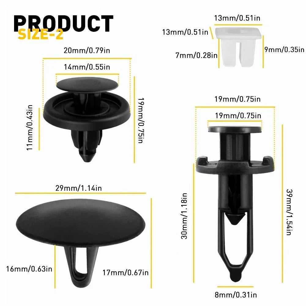 They can be used for Hood, Bumper, Fender Liner Retainer, Rear Bumper Cover Clip Push-Type Retainer, Screw Type Retainer, Door Trim Panel Retainer, Trim Panel & Hood Seal Clip, Nylon Screw Grommet replacement. It fits for Auto Car SUV Off-Road Pickup Truck.