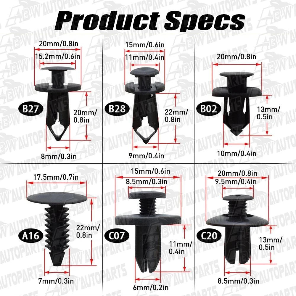 Various fasteners to meet the needs of different parts of the car.Used widely for car fender, bumper, door or other car surface.
