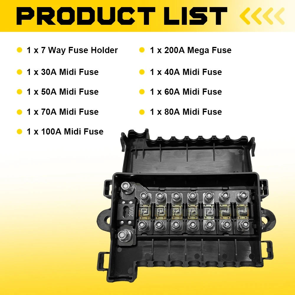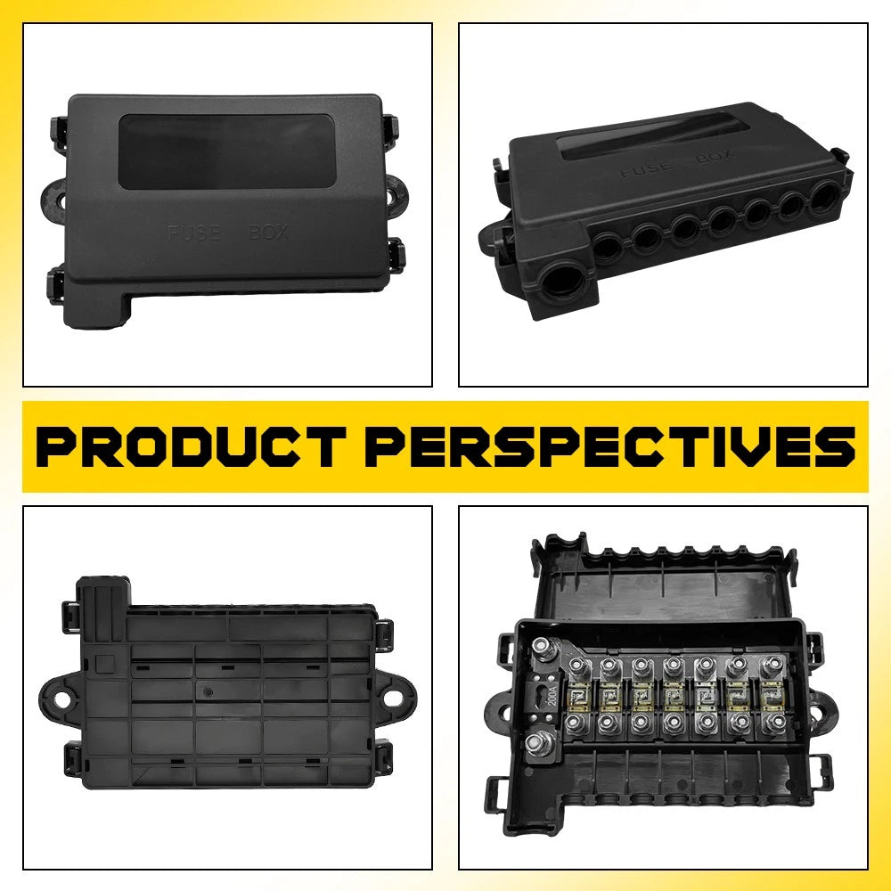 Built with high-quality copper terminals, a sturdy black body, and a plastic cover, this fuse box is tough enough to endure harsh conditions. Fuse specifications: 30A/40A/50A/60A/70A/80A/100A/200A.