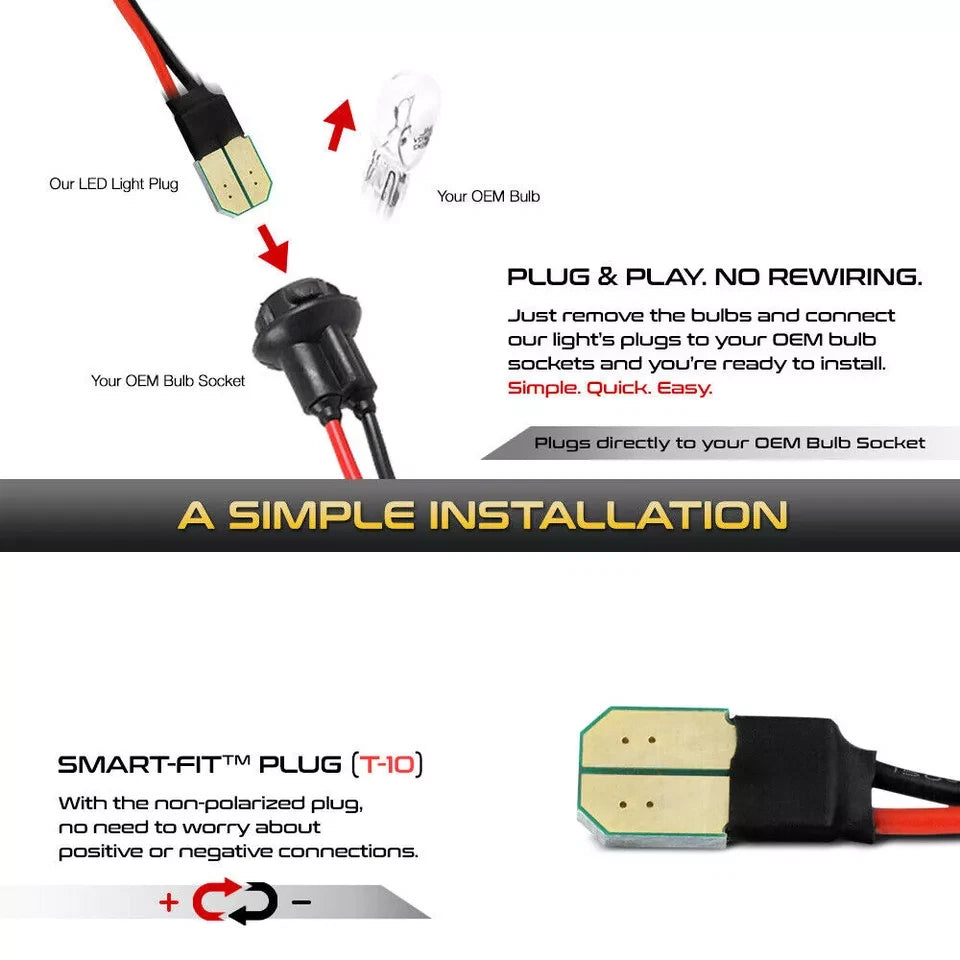 4.Installation:Plug and play, exact fit and direct replacement, no modification or trimming needed, just take out your original bulbs and plug new sidemarker lamps into socket, non-polarity sensitive, don't need to worry about connections.