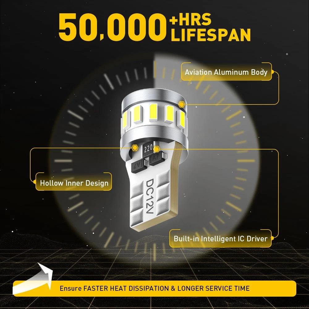 50,000 Hours Lifespan: Whole aviation aluminum body and hollow inner design diverts heat away from the light's critical components, our 194 led license plate light bulbs offer 50000hr lifetime, reducing the need for frequent replacements.