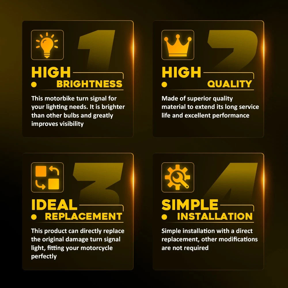 This motorcycle turn signal can be used as a Front and Rear turn signal light for your lighting needs. It is brighter than other light bulbs, greatly improving visibility and making your driving safer.