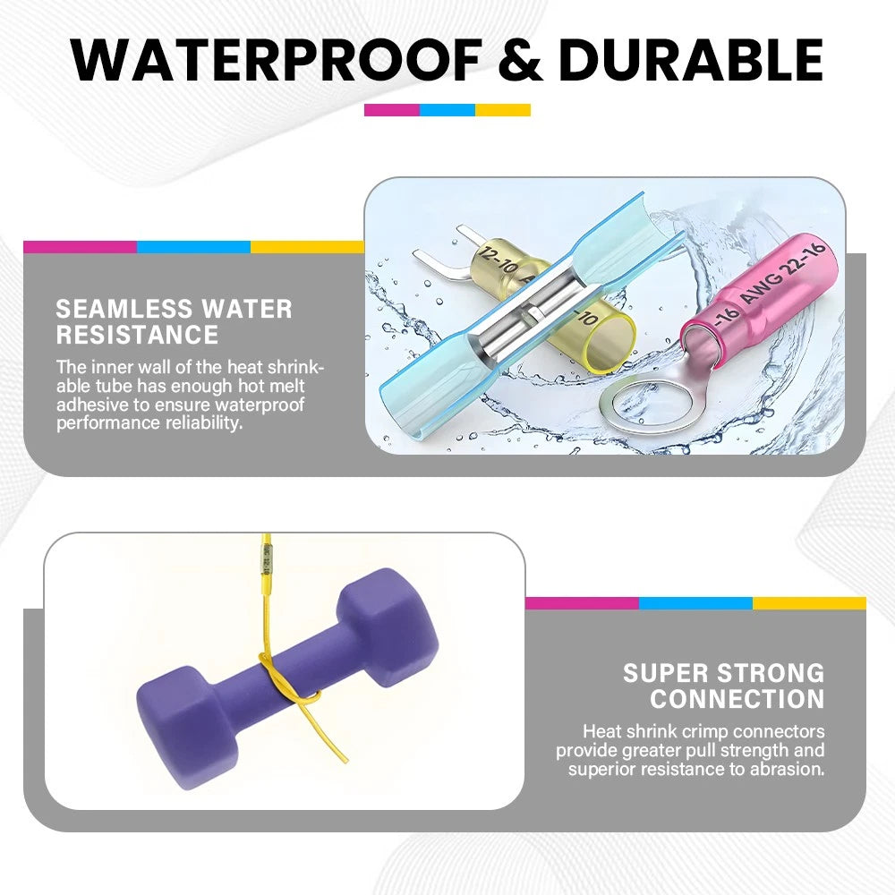 540Pcs/Set Heat Shrink Electrical Wire Crimp Connectors Marine Car Terminal Kit Fit for: Used in marine, automotive, RC, motorcycle and home electrical projects. Specifications: Product Material: Copper Colour: Blue, Pink, Yellow 3 Industry Standard Sizes: Red (22-16 AWG), Blue (16-14 AWG) and Yellow (12-10 AWG). Packaging Weight: 710 g Packaging Sizes (cm): 27.5 x 17.5 x 4 TERMINALS: RED 22-18AWG. HEAT SHRINK RINGS #10, 1/4", 5/16" & 3/8" 20 ea. ...... = 80 PCS. BLUE 16-14AWG. HEAT SHRINK RINGS #10, 1/4", 5/16" & 3/8".20 ea. = 80 PCS. BLUE 16-14AWG. SPADE TERMINALS 'FORKS" FOR STUDE SIZE #10 = 20 PCS. BLUE 16-14AWG. SPADE TERMINALS 'HOOKS" FOR STUDE SIZE #10 = 20 PCS. YELLOW 12-10AWG. HEAT SHRINK RINGS #10, 1/4", 5/16" & 3/8" .20 ea = 80 PCS. YELLOW 12-10AWG. SPADE TERMINALS "HOOKS" FOR STUD SIZE #10 = 20 PCS. Features: *Moisture Protection Dual-wall design with adhesive lining ensures a watertight seal, preventing wire or connection corrosion in harsh environments. *Wide Temperature Range Built to perform reliably from cold to intense heat, ensuring durable connections. *Coloured Coding Brightly coloured insulation sleeves offer easy identification of wire sizes, simplifying installation and reducing errors. Translucent tubing allows you to inspect your connections. *Superior Conductivity Made with premium tinned copper cores for excellent electrical flow with minimal resistance. *Quick & Secure Installation Heat shrink ratio of 3:1 allows for fast, tight seals over wires, ensuring long-lasting connections in automotive or marine applications. Used in marine, automotive, RC, motorcycle, and home electrical projects. Packaging Include: 540PCS Heat Shrink Wire Crimp Connectors