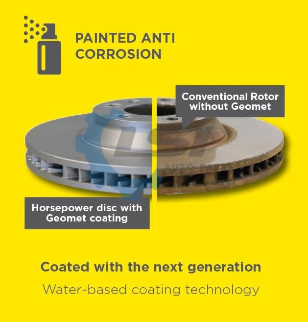 Full set Front and Rear Genuine brake pads and Horsepower Geomet Disc Rotors