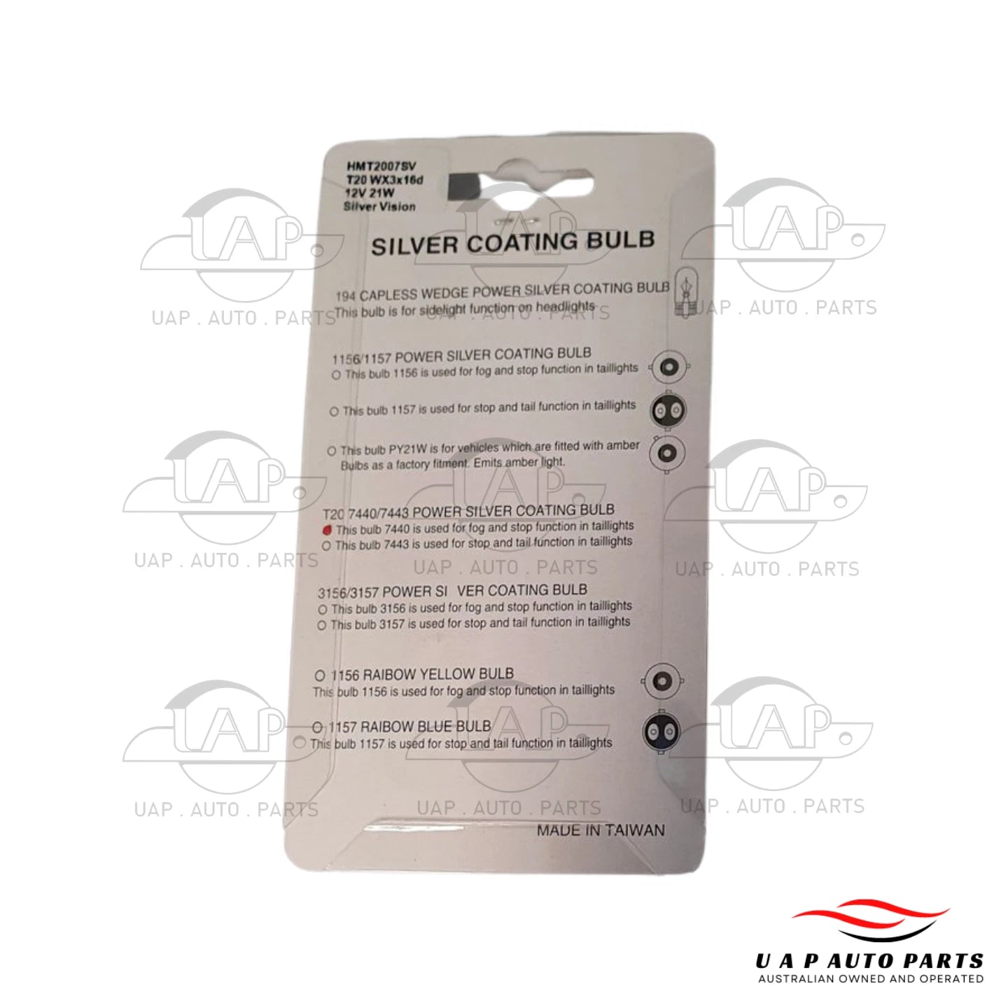 | Product Description Product | Wedge bulb Part number: HMT2007SV Type: Halogen Model: WY21W Base: WX3X16D Wattage: 21W Voltage: 12V Colour: Silver coated with amber light Qty per pack: 2 |