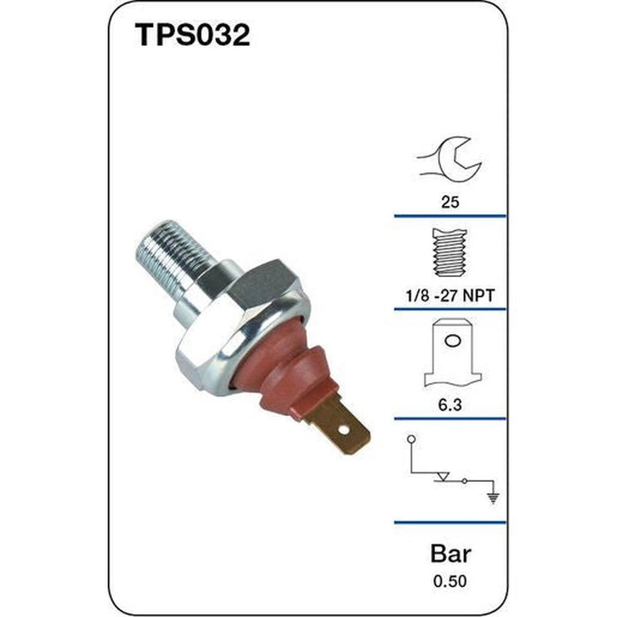 Notes: Spanner: 25mm, Thread: 1/8 - 27 NPT, Circuit Type: Normally Closed, Pressure: 0.50 (Bar) Sparesbox - Official eBay Store Tridon Oil Pressure Switch (Light) TPS032